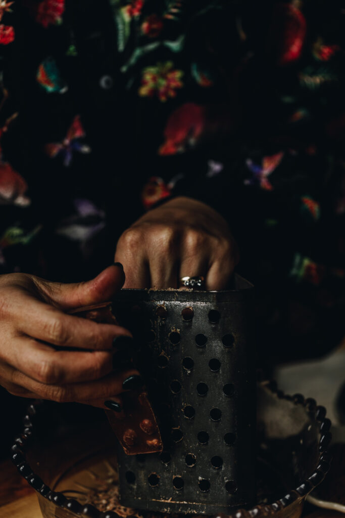 • As the dough rises, grate or cut up the tiakarete hānati (hazelnut chocolate) in to a medium bowl.