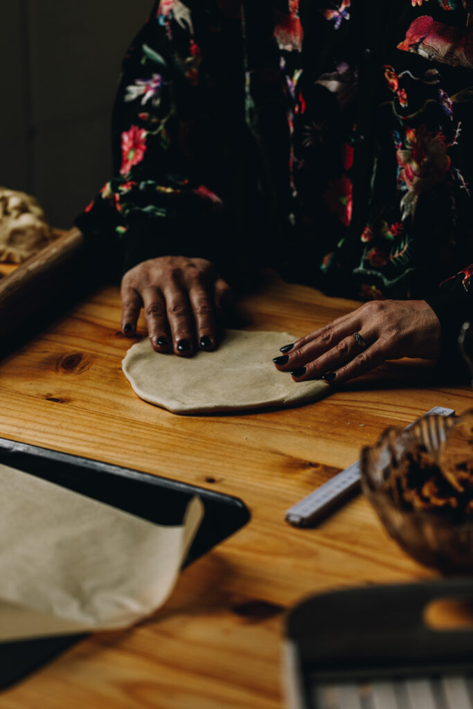 • Trace a 26cm plate on to baking paper and flip it over as a guide for how big the pieces of dough should be.