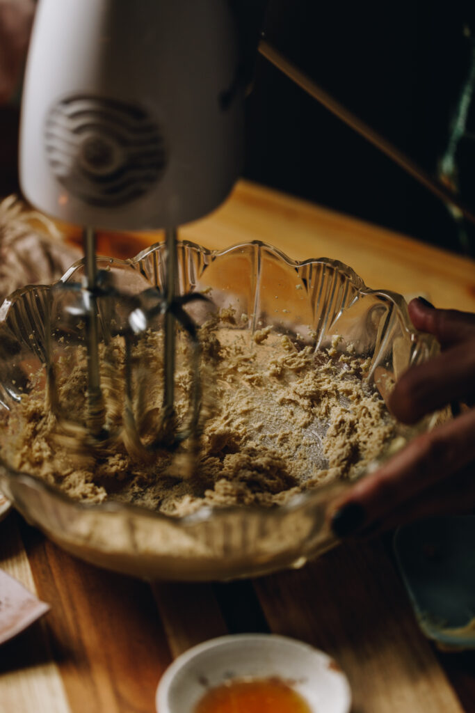 • Add the pata kūteretere (softened butter) and huka hāura (brown sugar) in to a medium bowl. Whip for 2 minutes until light in colour.