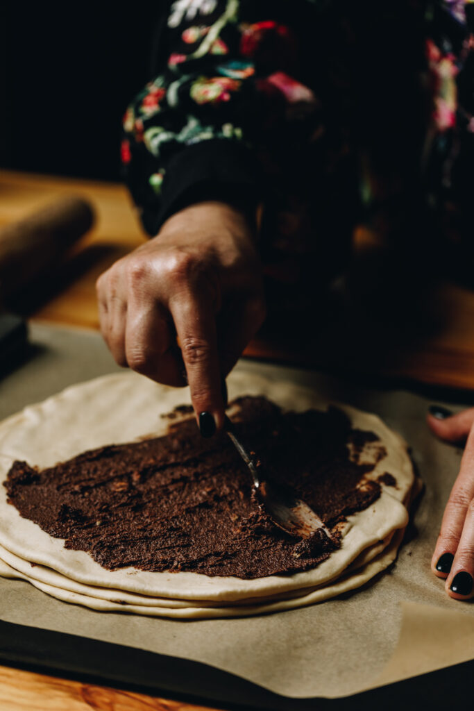 • Roll out the first piece of dough and place it on the baking paper. Spread a third of the chocolate hazelnut mixture on to the circle, leave the outer 1cm edge free from any spread.