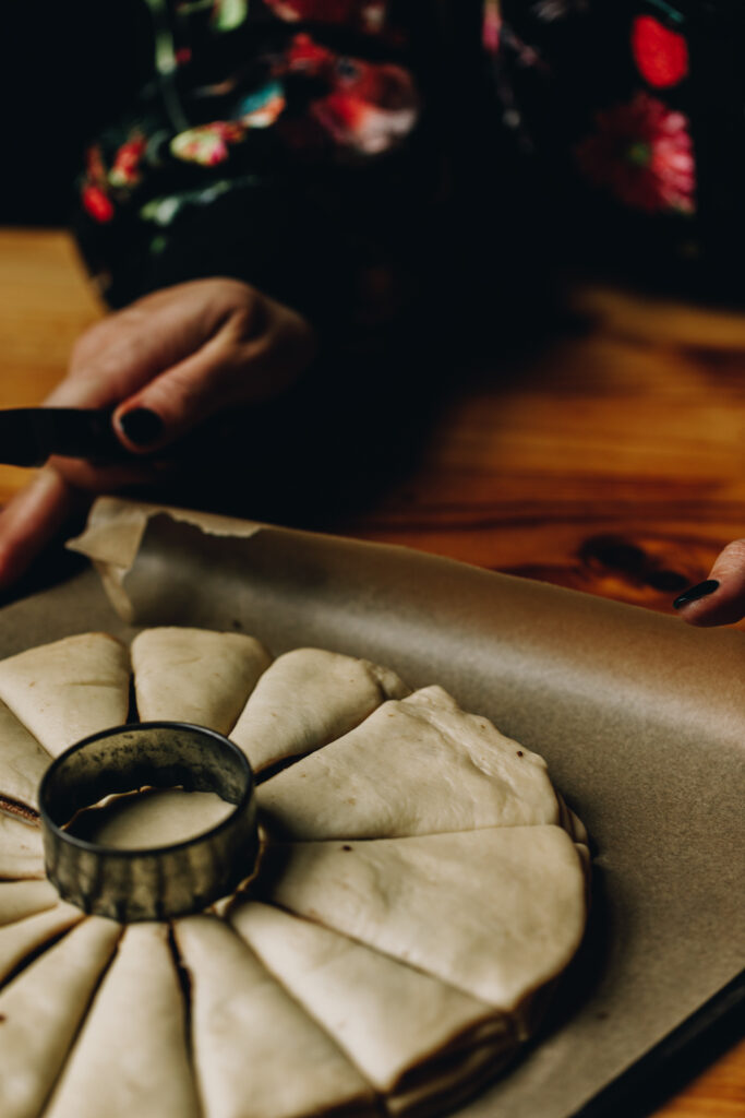 • Place a 6 cm cup in the middle of the circle. Cut the dough in to 16 equal pieces, cutting from the edge of the cup to the outer edge.