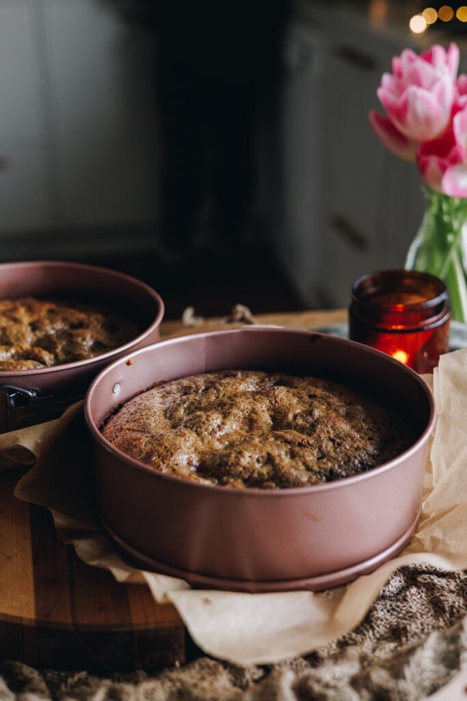 • Once the cakes have finished baking, remove from the oven and allow them cool in the tins for 5 minutes before flipping them out.