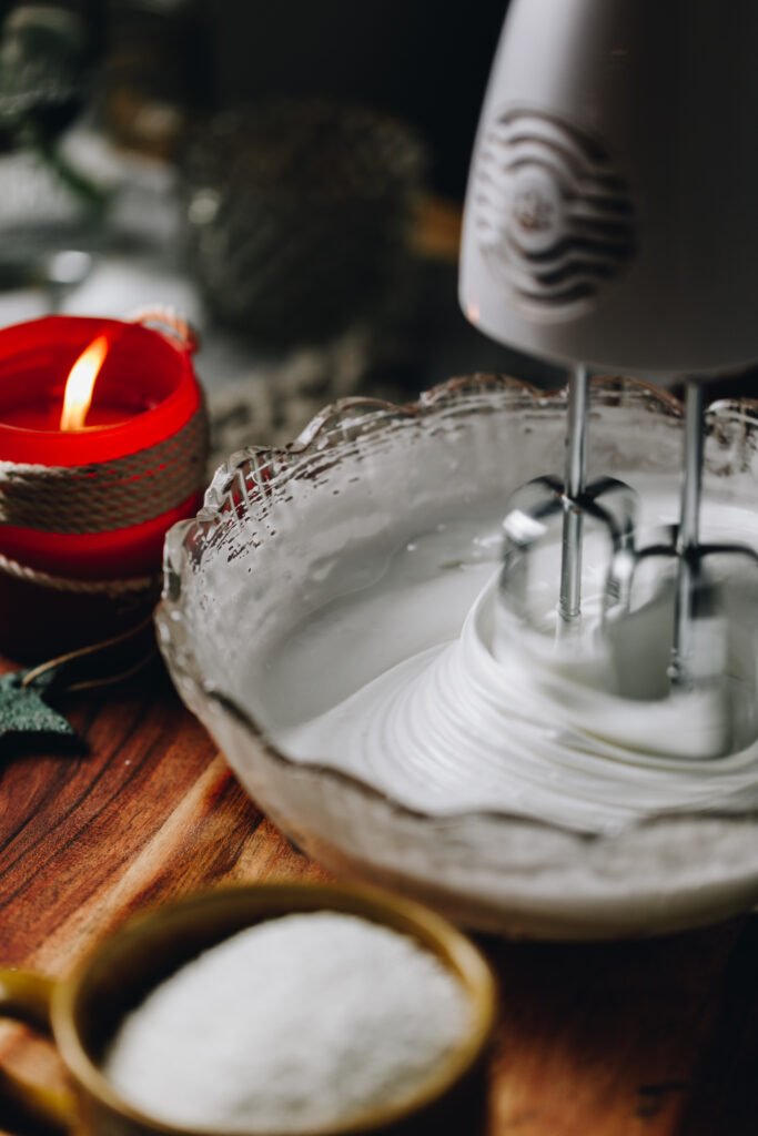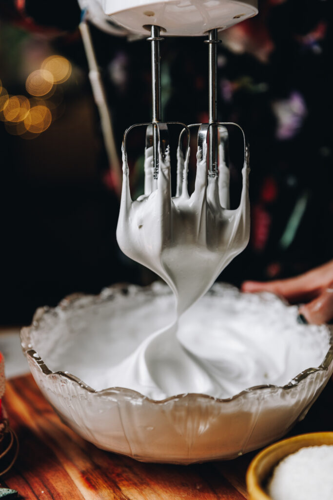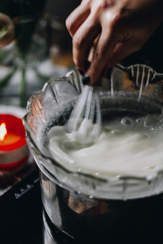 - Once it is ready, remove the heat and begin to whip on medium to high speed for 5-7 minutes or until you have reached stiff peaks.