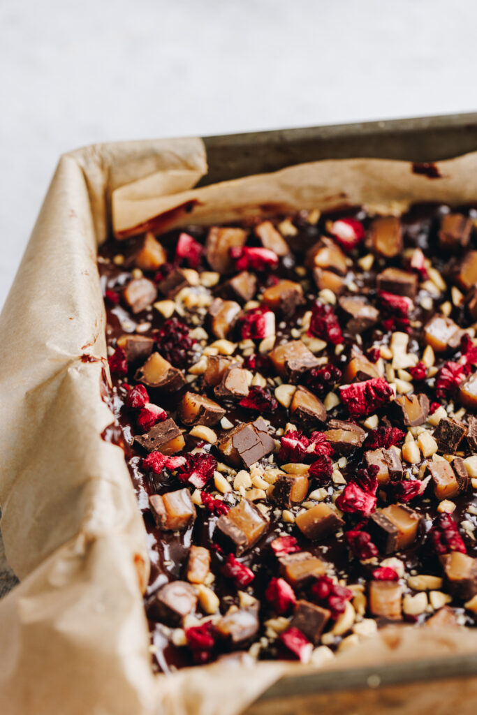 - If you want to decorate it, as you soon as you add the chocolate, place the pīnati (peanuts), karamea (caramels) and poihanapere tauraki-tio (freeze-dried boysenberries) over the top.