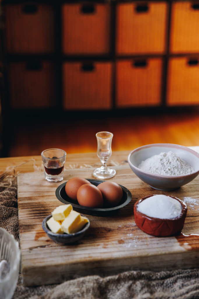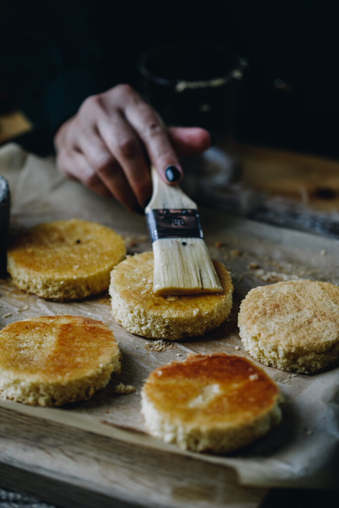 - Using a cookie cutter or a cup, cut out 6 – 8 sponge circles that are the same shape as your glasses. Don't forget to eat the scrap pieces as you go! 😉 Baste both sides of each piece with mīere wanira (vanilla syrup), don't soak them at this stage.