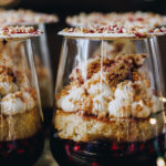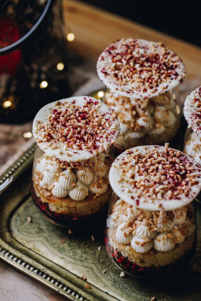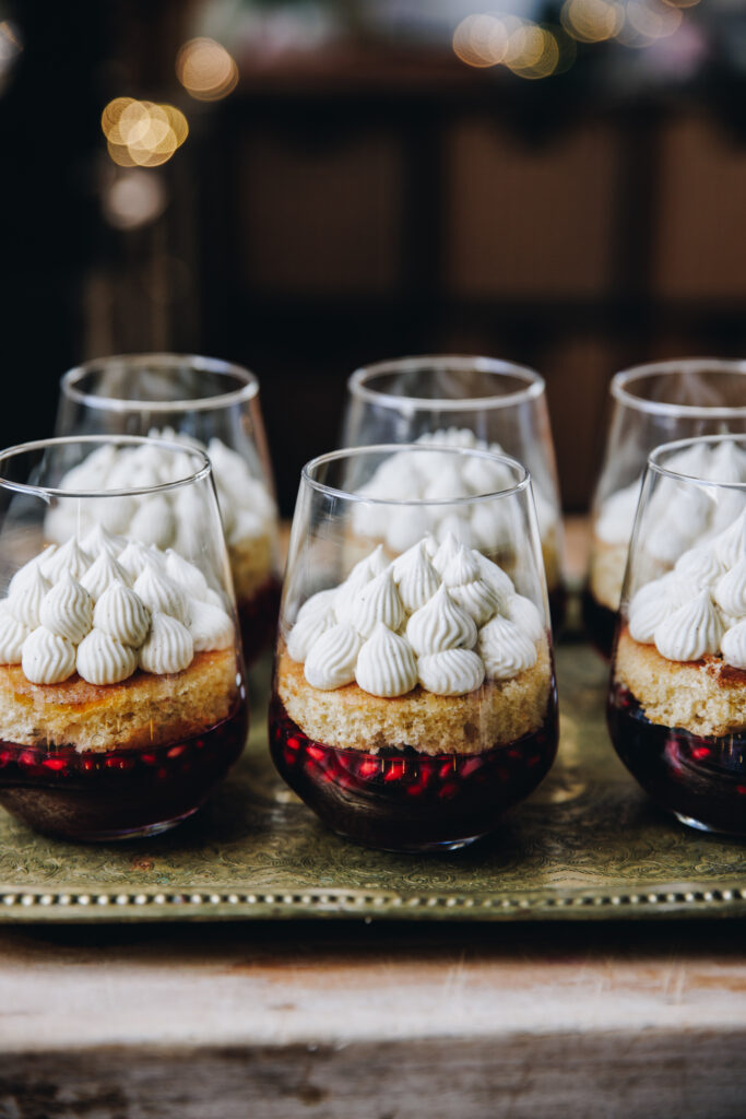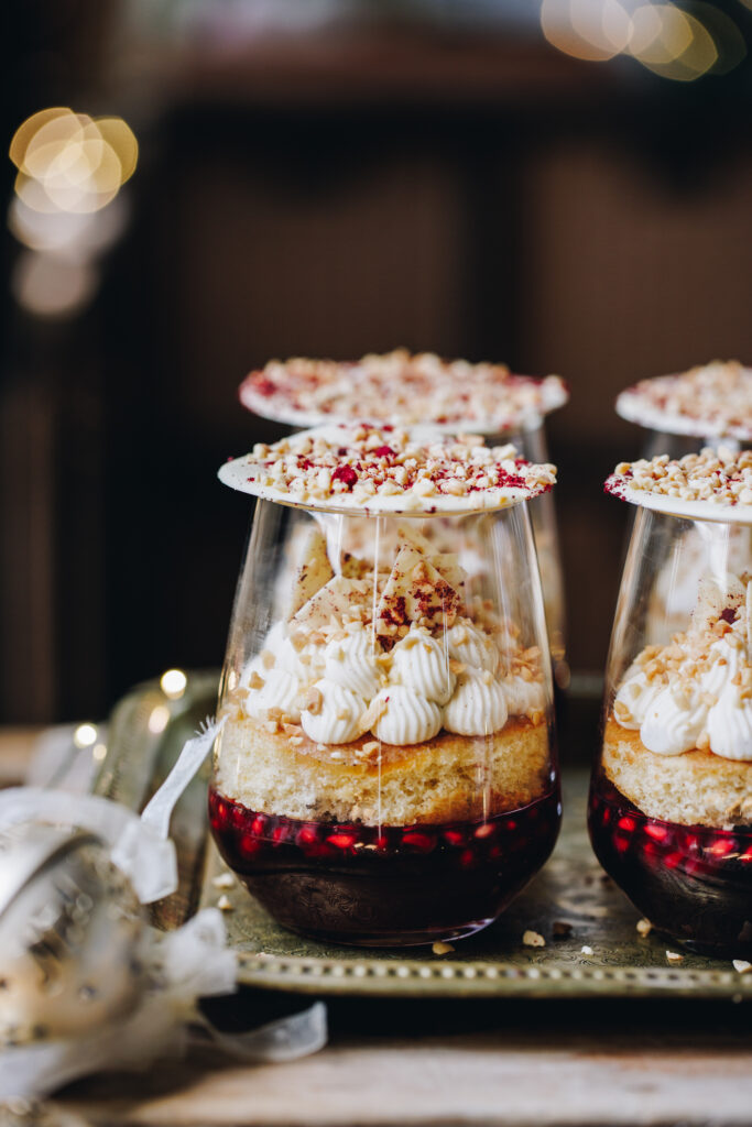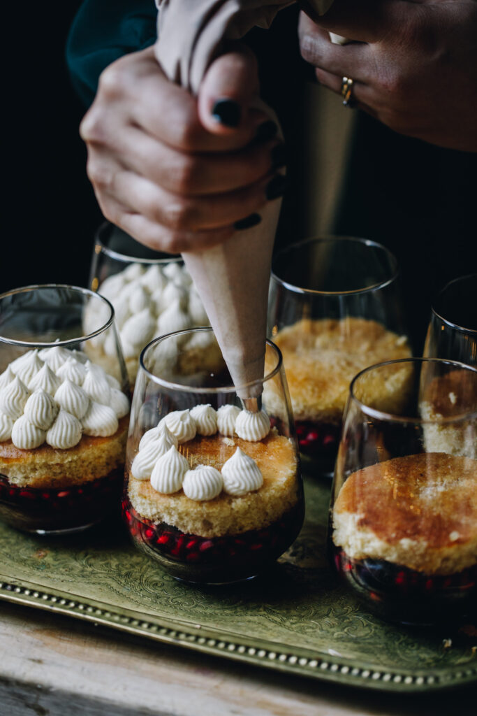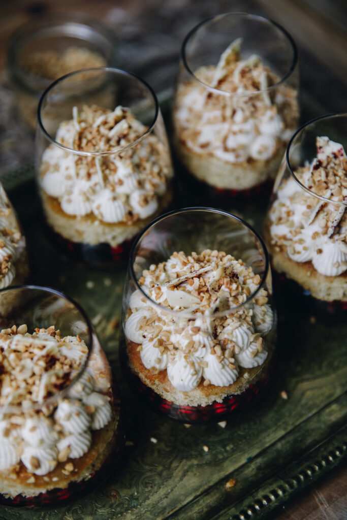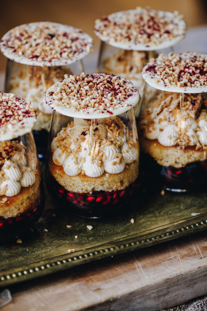 Everyone loves trifle right? Hmmm….I am actually not the biggest fan. Sometimes, the gooey texture of every element puts me off! I know that might be outrageous to some but that is exactly why I created these purini (desserts). They have all the elements of a trifle but they are divided between layers of different textures and flavours. We have a bright tieri karanipere (cranberry jelly) with fresh kākano pamakaranete (pomegranate seeds) and tūrutu (blueberries). We top it with a fresh keke kōpungapunga (sponge cake) that is gently soaked in a mīere wanira (vanilla syrup). Fresh kirīmi tāwhiuwhiu (whipped cream) folded with kahitete (custard) sits on top with white chocolate shards and a little pōtae (hat) for each dessert. Make the dessert up to two days before you are going to using it!