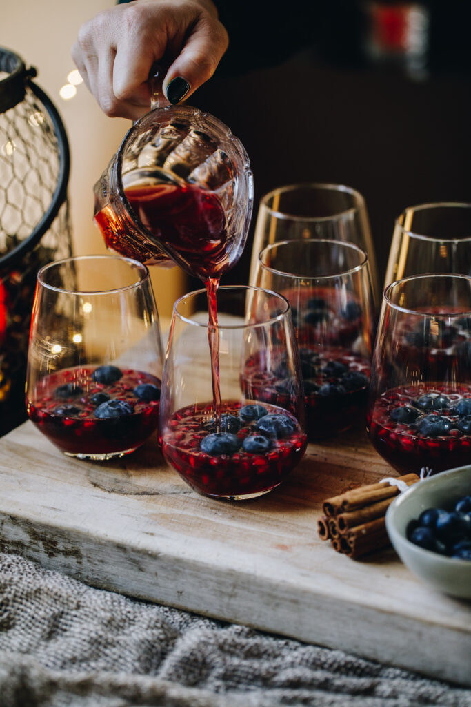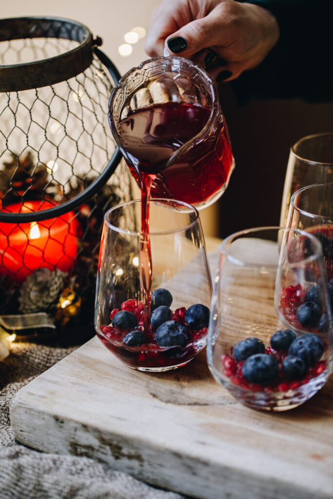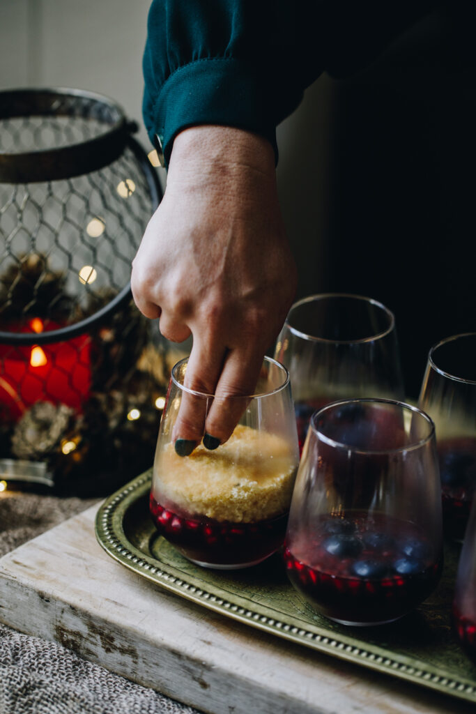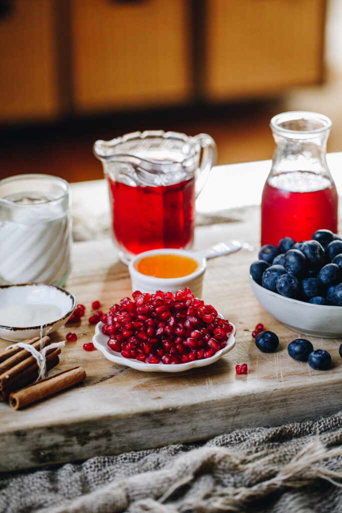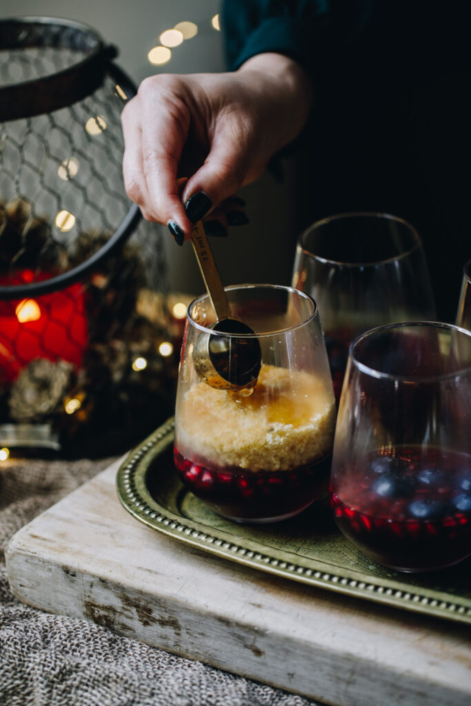 - Add the kākano pamakaranete (pomegranate seeds) and tūrutu (blueberries) in to each glass. Pour around ¼ – ⅓ C of the jelly liquid in to each glass. Set in the fridge for an hour, until the jelly is just set.