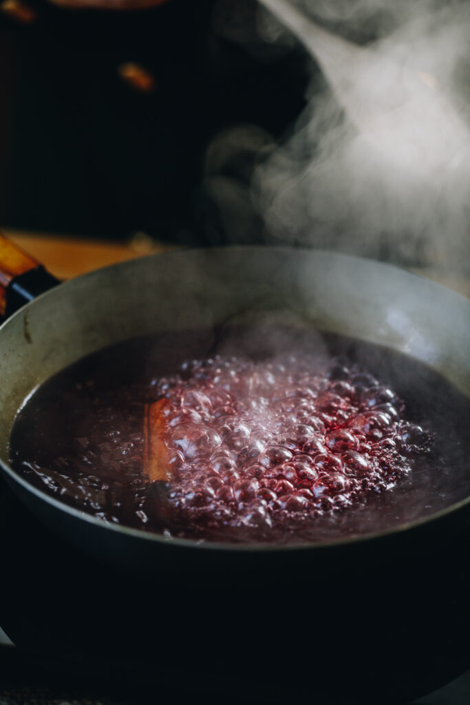 - Pour 250ml (half) of the wai karanipere (cranberry juice), huka one (caster sugar) and rākau hinamona (cinnamon sticks) into a pot. Simmer until the sugar is dissolved.