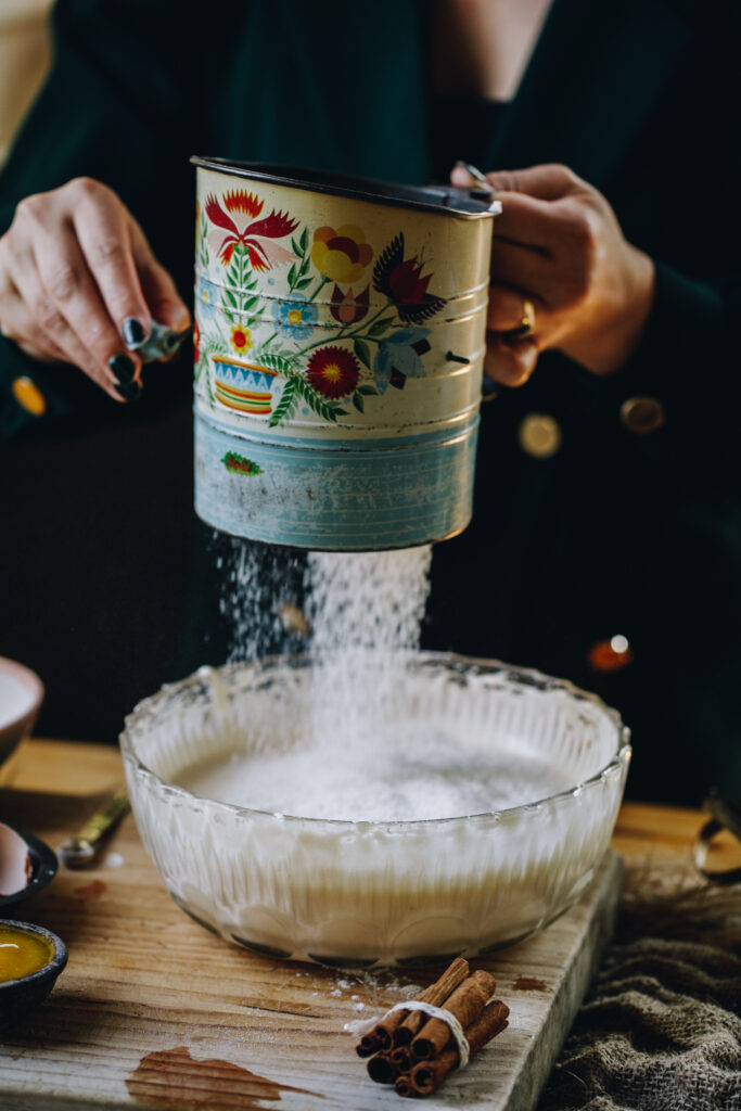 - Sift the puehu parāoa (flour) and pēkana paura (baking powder) in to the egg mixture. Fold it gently through. Add the cooled pata (butter) around the edge of the bowl in two additions, folding after each addition.